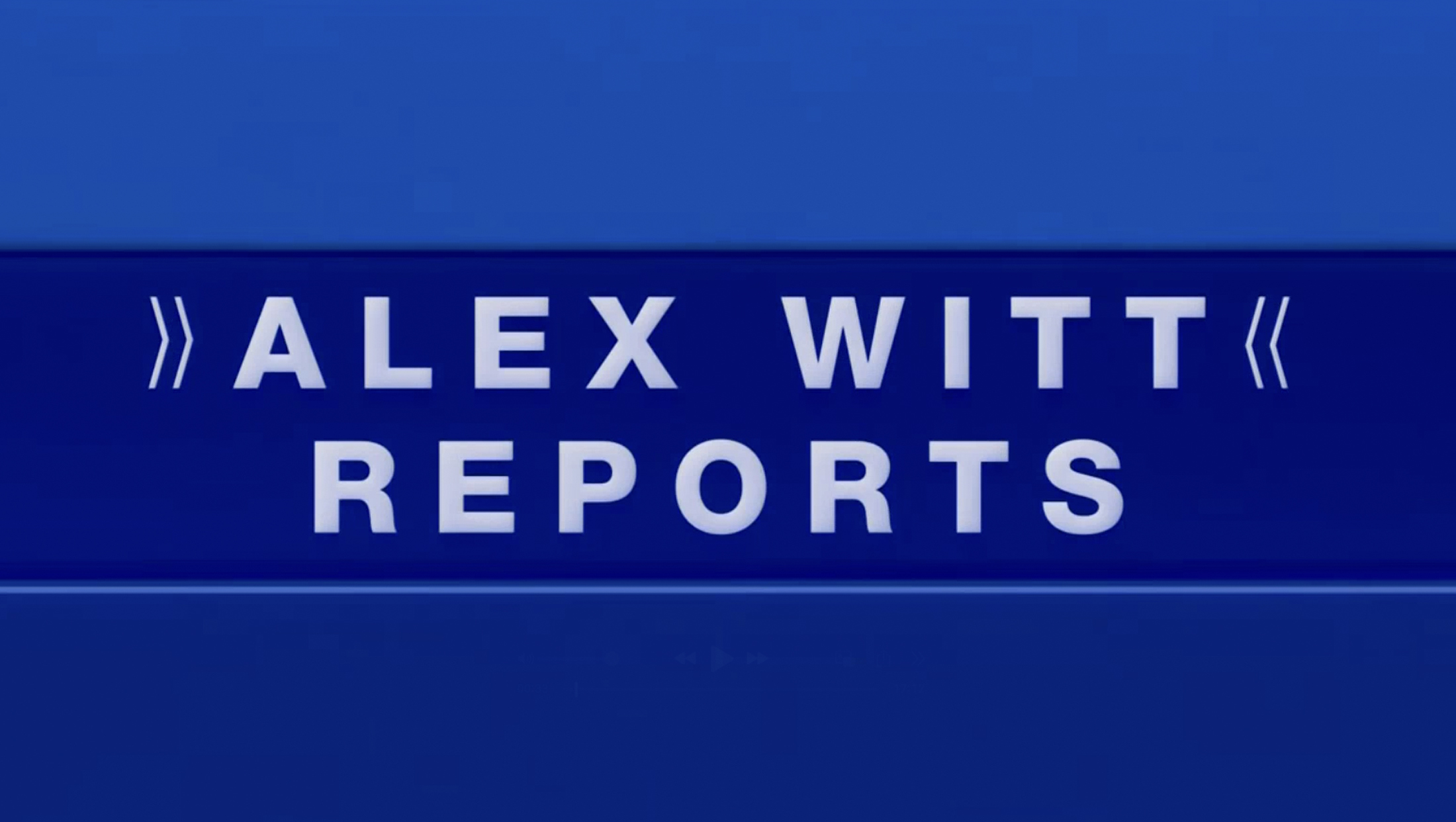 Sandwiched in the middle is the anchor’s name and “Reports” spread over two lines, with the name featuring inward-pointing double chevron accents.