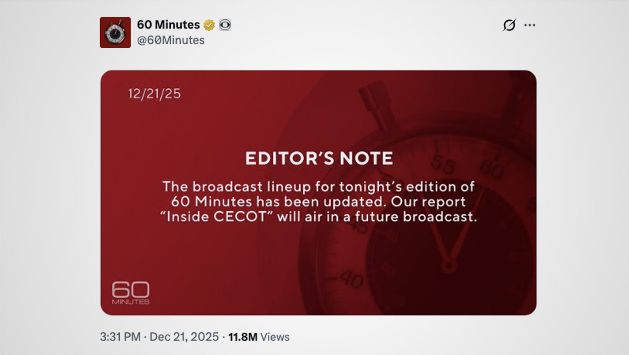 CBS News had also already been promoting the story ahead of the Dec. 21 airdate and posted an “Editor’s Note” to social media Sunday afternoon reading “The broadcast lineup for tonight’s edition of 60 Minutes has been updated. Our report ‘Inside CECOT’ will air in a future broadcast.”