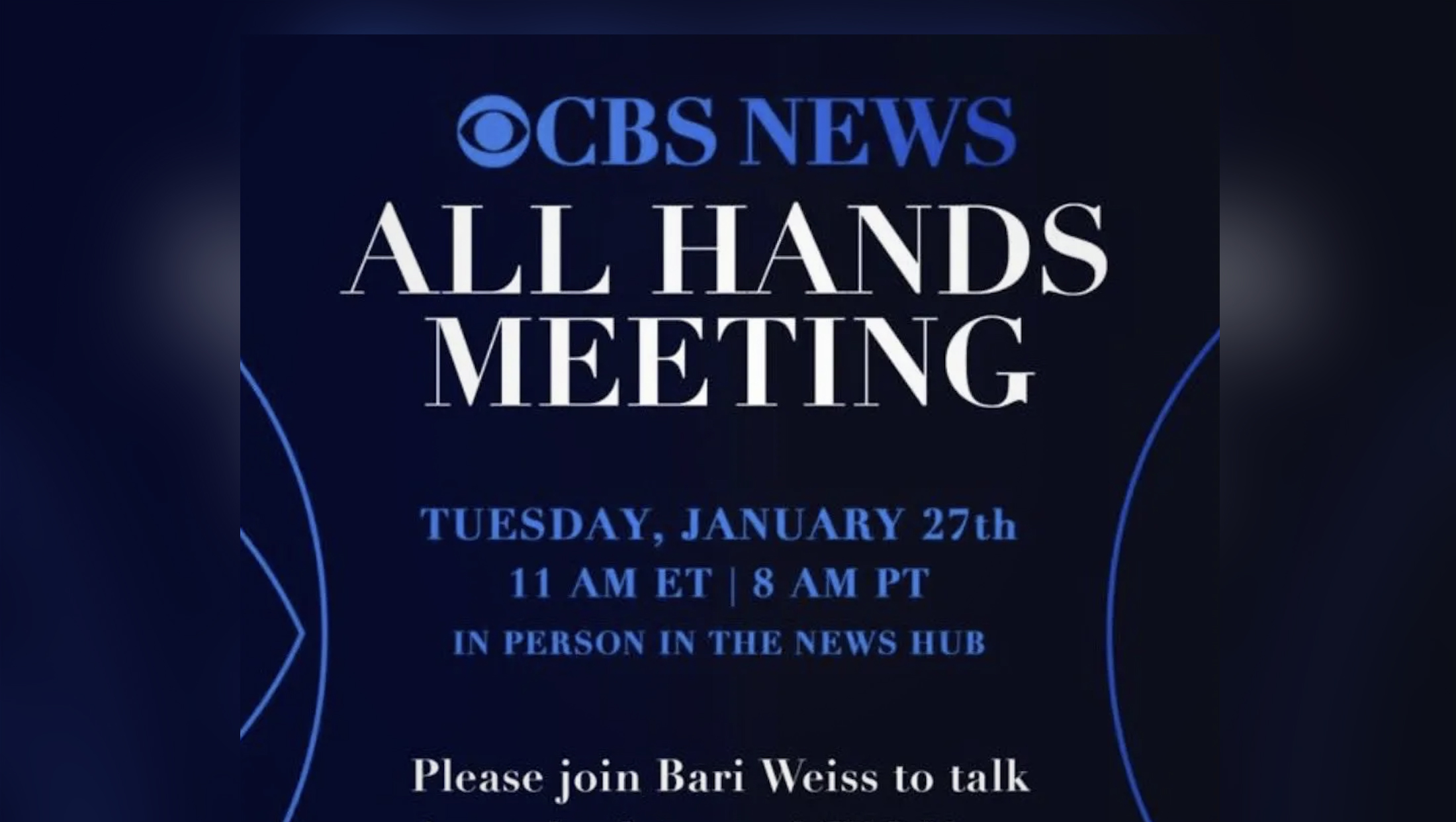 “All hands” meetings have also gained a negative connotation in many industries, including tech and media. These meetings are often used to announce major shifts in strategy, financials or other initiatives, including ones that will affect people’s jobs — though there’s no indication if CBS News will announce cuts at the Jan. 27 event.