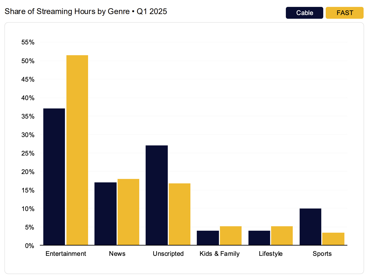 FAST viewers saw four minutes of advertising per hour on average, compared to 12 minutes per hour on cable television. The reduced ad load represents one-third of the commercial time found in traditional linear TV.