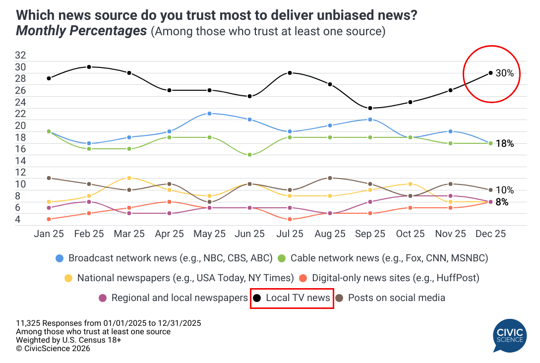 New data from CivicScience shows that local television news remains the most trusted source of information for Americans, even as confidence in broadcast networks and social media continues to decline.