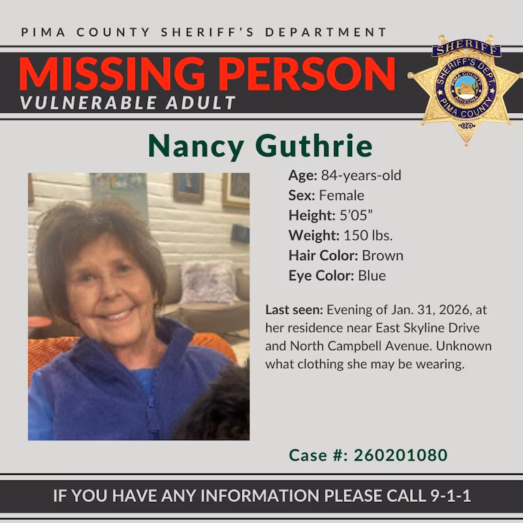 Nancy Guthrie was last seen at her home in the Catalina Foothills area Saturday, Jan. 31, 2026, around 9:30 p.m., officials said at a news conference Feb. 1, 2026. She had been reported missing earlier Sunday by a family member.